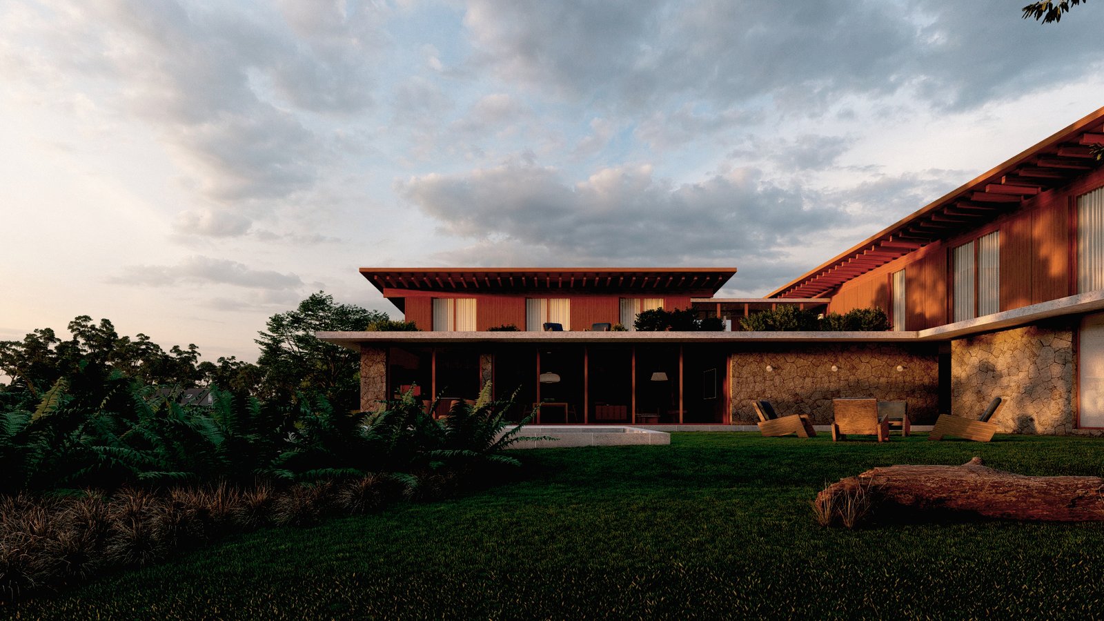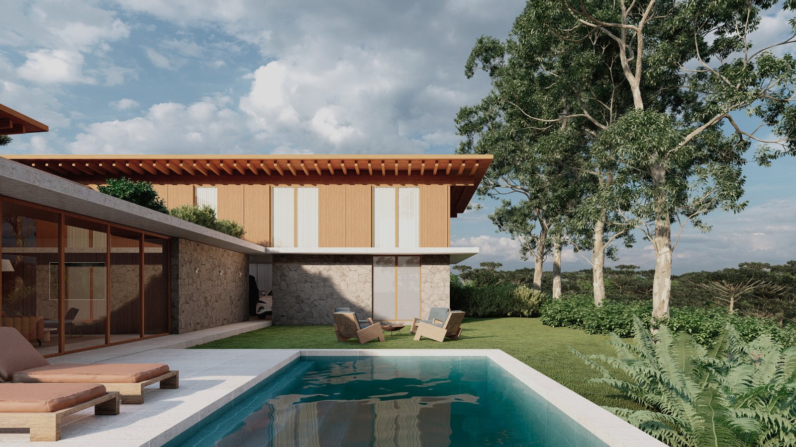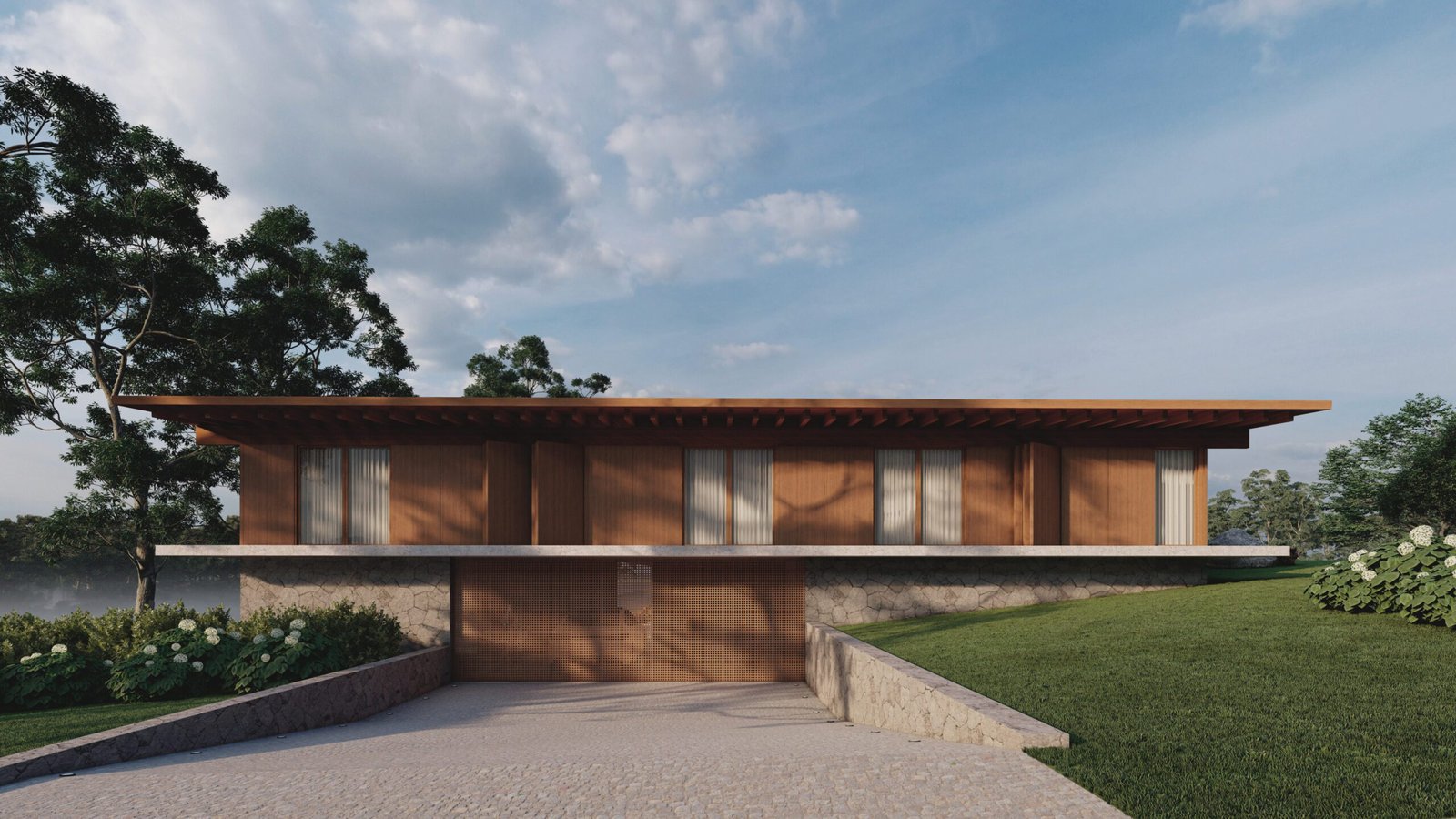 Tomando como partido a topografia do terreno e principalmente a vista para o vale com uma mata de araucárias, as linhas horizontais da casa na parte mais alta do terreno se assentam sobre uma base de pedras, proporcionando um aproveitamento da vista a partir de todos os ambientes.