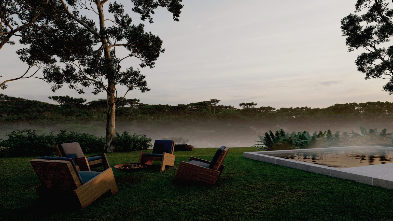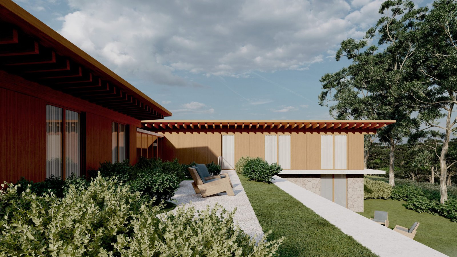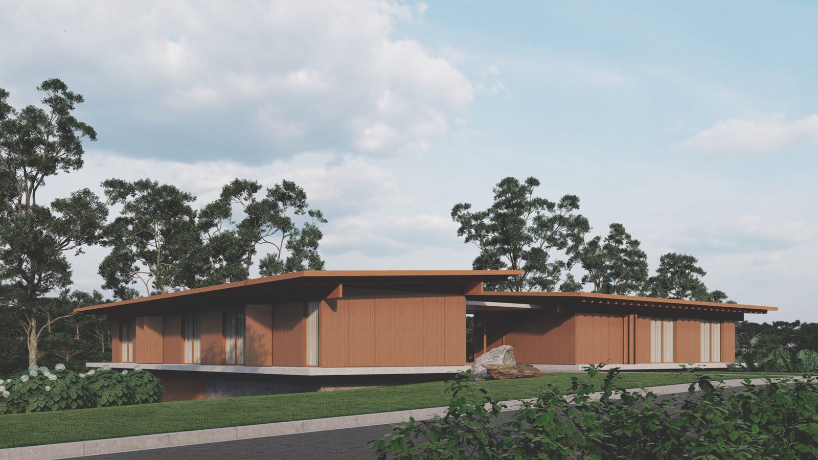 Tomando como partido a topografia do terreno e principalmente a vista para o vale com uma mata de araucárias, as linhas horizontais da casa na parte mais alta do terreno se assentam sobre uma base de pedras, proporcionando um aproveitamento da vista a partir de todos os ambientes.